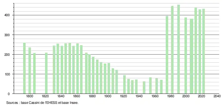 L'évolution du nombre d'habitants est connue à travers les recensements de la population effectués dans la commune depuis 1793. Pour les communes de moins de 10 000 habitants, une enquête de recensement portant sur toute la population est réalisée tous les cinq ans, les populations de référence des années intermédiaires étant quant à elles estimées par interpolation ou extrapolation[15]. Pour la commune, le premier recensement exhaustif entrant dans le cadre du nouveau dispositif a été réalisé en 2007[16].