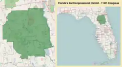 Le 3e district congressionnel de 1993 à 2012 était géographiquement diversifié. Partant de la partie sud du district, il comprenait la région de Pine Hills de la région métropolitaine d'Orlando-Kissimmee avec de petites poches de quartiers afro-américains dans les villes de Sanford, Gainesville, Palatka et enfin les plus grandes communautés afro-américaines de Jacksonville. Ces zones étaient reliées par des régions peu peuplées, soit de vastes zones rurales, soit des bandes étroites de quelques kilomètres de large seulement. Barack Obama a obtenu 73 % des voix dans ce district lors de l'élection présidentielle de 2008. L'ancien 3e district était représenté de 1993 à 2012 par Corrine Brown, qui a été élue dans le nouveau 5e district similaire lors des élections de novembre 2012.