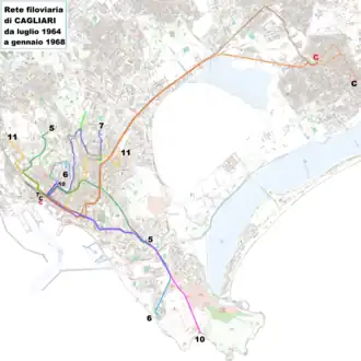 Quelques semaines plus tard, la Ligne 7 est mise en service à son tour. Partant de la gare FS Piazza Matteotti, elle conduit Via La Vega en desservant Via Manno et Terrapieno. Cette ligne a été prolongée jusqu'au marché de San Benedetto et le quartier de Via Dante qui venait d'être construit. En 1956, la Ligne 6 est mise en service, elle démarre de la très centrale Piazza Palazzo pour aboutir à Borgo Sant'Elena en passant par Via Roma et la Basilique de Bonaria.