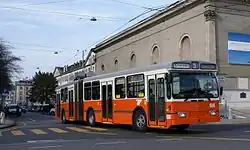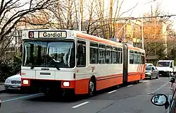 | Articulé[27] | Berna/SWS | SAAS | 21 | 601-621 en 1988 : 609, 618 et 607 renumérotés 32, 96 et 99 (véhicules école) | 1965 | 1988 (601, 606, 608, 610, 614, 619 et 620) 1991 (32 et 96) 1992 (99, 602 à 605, 611 à 613, 615 à 617 et 621) | Première série de trolleybus articulés à Genève. | ![]() |