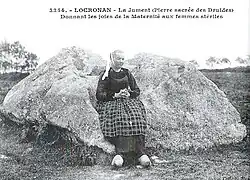 La « jument de pierre », dite aussi « chaise de Ronan », serait le reste d'un phallus géant associé à un culte de la fécondité qui aurait dominé Locronan à l'époque néolithique et cassé en trois morceaux dont deux auraient disparu, débités. Les Celtes, puis les Chrétiens auraient conservé ce culte. Jules Barbot en 1901 écrit : « Au commencement du XIXe siècle, les femmes stériles se frottaient sur deux rochers de Locronan. (…). Il y a peu d'années, les jeunes épousées venaient se frotter le ventre à la « jument de pierre » (…) ; les femmes stériles se couchaient sur elle pendant trois nuits consécutives, avec l'espoir de devenir mères »[5]. Cette croyance ne concernait pas que les classes populaires ; Jacques Cambry raconte :