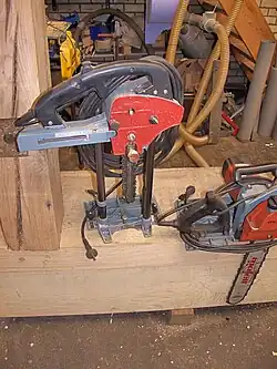 la même machine automatisée et bien guidée permet de débiter du bois d'œuvre sur une scierie mobile avec une seule personne (Chainsaw mill(en)) ou en menuiserie,