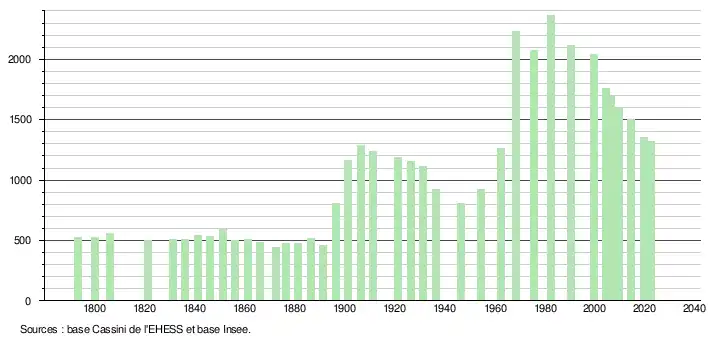 L'évolution du nombre d'habitants est connue à travers les recensements de la population effectués dans la commune depuis 1793. Pour les communes de moins de 10 000 habitants, une enquête de recensement portant sur toute la population est réalisée tous les cinq ans, les populations de référence des années intermédiaires étant quant à elles estimées par interpolation ou extrapolation[30]. Pour la commune, le premier recensement exhaustif entrant dans le cadre du nouveau dispositif a été réalisé en 2004[31].
