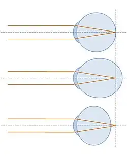 Dans un œil normal, qu'on qualifie d'emmétrope, l'image donnée d'un objet lointain est située sur la rétine. On dit aussi que la rétine est au plan focal de l'ensemble cornée-cristallin. En vision de près, le pouvoir d'accommodation du cristallin (qui se bombe), permet d'avancer le point nodal pour maintenir sur la rétine l'image de l'objet observé. Moins l'optique oculaire est en mesure de focaliser correctement l'image des objets sur la rétine, plus la vision s'en trouve détériorée. Les troubles de la réfraction sont les plus courants, mais aussi souvent les plus bénins des troubles de la vision. Les anomalies de réfraction axile sont liées à une longueur de l'œil trop longue ou trop courte, les anomalies de réfraction de puissance (dites aussi d'indice de réfraction) sont liées à des variations de l'anatomie de la cornée ou du cristallin[1].