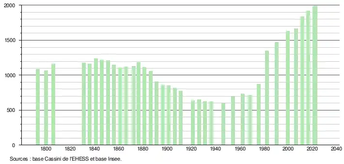 | L'évolution du nombre d'habitants est connue à travers les recensements de la population effectués dans la commune depuis 1793. Pour les communes de moins de 10 000 habitants, une enquête de recensement portant sur toute la population est réalisée tous les cinq ans, les populations de référence des années intermédiaires étant quant à elles estimées par interpolation ou extrapolation[26]. Pour la commune, le premier recensement exhaustif entrant dans le cadre du nouveau dispositif a été réalisé en 2006[27]. En 2022, la commune comptait 1 992 habitants[Note 7], en évolution de +3,86 % par rapport à 2016 (Tarn : +2,52 %, France hors Mayotte : +2,11 %). |