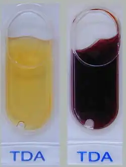 Pour mettre en évidence la TDA, quelques gouttes de chlorure de fer III sont ajoutées (le réactif, jaune, est en solution dans l'acide chlorhydrique pour éviter la précipitation de l'hydroxyde de fer III). Un composé marron apparait quand l'acide indol-pyruvique est présent. Une uréase +, qui alcalinise le milieu, ne gène pas la lecture à cause de l'acidification due au réactif. Quand la réaction est négative, le milieu est jaune.