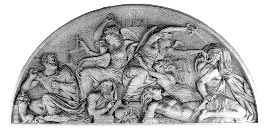 Le sculpteur Henry de Triqueti avait reçu la commande de deux bas-reliefs en 1833 pour le palais Bourbon[16]. Ces deux œuvres de format identique ont pour titre La Loi vengeresse et La Loi Protectrice[16]. Ces deux bas-reliefs rendent hommage aux valeurs de la monarchie de Juillet telles que la loi, la prospérité, l'ordre public, l'agriculture, l'industrie et le commerce, ils présentent une loi triomphante et garante de la civilisation en assurant la prospérité, la punition et la protection[17]. Des deux reliefs La Loi vengeresse est le plus tumultueux, on peut y voir un philosophe (probablement Socrate) entouré de deux figures ailées qui punissent les meurtriers et les voleurs à l'aide de leurs épées[17].
