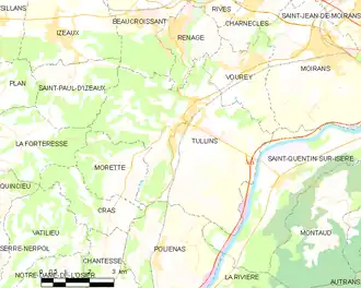 L'agglomération de Tullins se situe à flanc de coteaux, sur les derniers contreforts boisés du plateau de Chambaran.