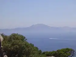 Photo du détroit vu du rocher de Gibraltar. Les montagnes marocaines du Rif sont en arrière-plan.