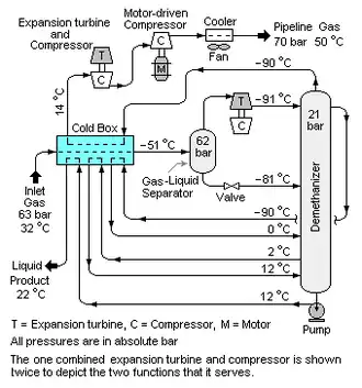 Lorsqu'ils sont transformés en sous-produits finis (voir traitement du gaz naturel), ces hydrocarbures plus lourds sont appelés condensat de gaz naturel. L'extraction de ce condensat implique souvent une turbine d'expansion[13] et une colonne de distillation à basse température (appelée déméthaniseur) comme le montre la figure. Le gaz d'entrée du déméthaniseur est d'abord refroidi à environ −51 °C dans un échangeur de chaleur (appelé cold box - boîte froide), ce qui entraîne une condensation partielle. Le mélange gaz-liquide résultant est ensuite séparé en un flux gazeux et un flux liquide.
