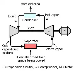 La phase liquide s'écoule ensuite à travers le turbodétendeur, où la chute de pression due à l'expansion isentropique entraîne sa vaporisation partielle. En sortie de turbine se trouve un mélange liquide-vapeur à basse température. Le mélange liquide-vapeur circule ensuite dans l'évaporateur, où il est vaporisé par la chaleur absorbée provenant de l'espace à refroidir. Le réfrigérant vaporisé s'écoule ensuite vers l'entrée du compresseur pour terminer le cycle.