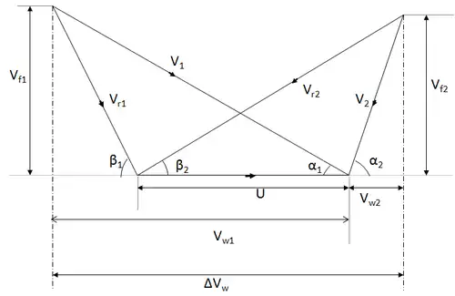 - et (représentés par U) sont les vitesses tangentielles de l'aube à l'entrée et à la sortie respectivement, différentes si les rayons et sont différents.