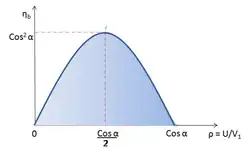 Si ω est la vitesse angulaire de rotation de la turbine, alors la vitesse de l'aube est . La puissance développée est alors .