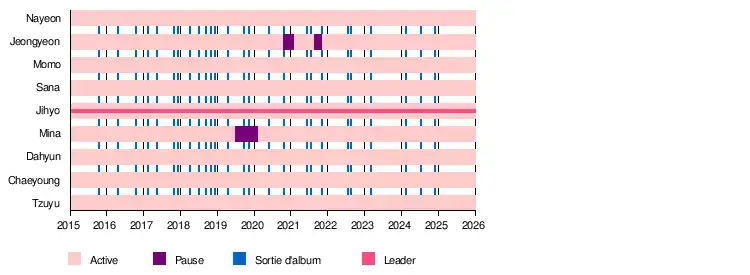 | Jihyo | 지효 | Park Ji-soo puis Park Ji-hyo | 박지수 puis 박지효 | Leader, chanteuse principale | ||