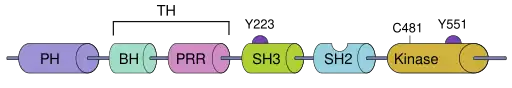 - ↑ Yamadori T, Baba Y, Matsushita M, Hashimoto S, Kurosaki M, Kurosaki T, Kishimoto T, Tsukada S, « Bruton's tyrosine kinase activity is negatively regulated by Sab, the Btk-SH3 domain-binding protein », Proc. Natl. Acad. Sci. U.S.A., vol. 96, no 11, , p. 6341–6 (PMID 10339589, PMCID 26883, DOI 10.1073/pnas.96.11.6341)