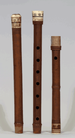 Il est en roseau de 40 cm, avec six trous de jeu et des nœuds rehaussés de bagues.