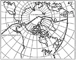 Commandé par William R. Anderson, le Nautilus quitta New London le 16 août 1957 et atteignit la mer du Groenland, où il fit surface le 1er septembre à 79° N, 05° E. En route, une visée radar fut réalisée sur l’île de Jan Mayen. Après avoir localisé la banquise 30 milles plus au nord, le sous-marin plongea à 92 mètres et avança sous la glace à 12 nœuds. Lors d’une tentative de remontée dans une polynie, il heurta un bloc de glace flottante, endommageant son périscope[10]. Le Nautilus, non conçu pour la navigation arctique, présentait des superstructures en aluminium incapables de résister aux chocs verticaux. Après une réparation improvisée du périscope endommagé, une seconde traversée sous la glace débuta le 3 septembre à 108 mètres de profondeur et à 12 nœuds vers le nord. Le 4 septembre, après avoir parcouru 360 milles sous la banquise, une panne électrique temporaire affecta les gyrocompas, compromettant la navigation. Pour estimer la position du sous-marin, l’équipage dut se fier au cap du gyrocompas et à la distance mesurée par le compteur de tours d’hélice, une méthode ancienne de navigation sous-marine[10]. Sous la banquise, sans moyen de recalage précis, le Nautilus poursuivit sa route vers le nord en suivant le cap donné par le gyrocompas Mark 23. Après six heures, la stabilisation du gyrocompas principal permit de faire demi-tour et de mettre le cap au sud. En analysant les variations de température de l’eau et les caractéristiques de la glace, l’équipage ajusta la trajectoire vers le sud-est, atteignant la mer libre le 6 septembre. L'objectif initial de la mission ne fut pas atteint, mais cette plongée de 74 heures sur 962 milles démontra la supériorité du sous-marin nucléaire en milieu arctique[10].