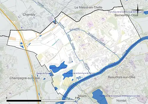 Avec une superficie réduite de 5,14 km2, la majorité du territoire communal est couverte par la ville et les zones industrielles et commerciales. Ne restent que des surfaces agricoles sur le secteur nord-ouest, près du connecteur de l'autoroute avec la RD 4 et du cimetière. Les espaces boisés sont rares. L'Esches est canalisée en ligne droite sur une grande partie de son parcours à travers le territoire communal. Le relief est peu varié, avec une altitude minimale de 24 m à la sortie de l'Oise du territoire communal, alors que la ville est bâtie dans la plaine à une altitude dépassant rarement les 30 m. Le point culminant à l'extrémité nord-ouest du territoire communal atteint 58 m au pied de la butte-témoin du Bois de la Tour du Lay, atteignant 177 m (communes de Ronquerolles et Champagne-sur-Oise).