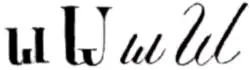 La lettre est aussi utilisée dans l’alphabet phonétique d’Edwin Leigh de 1866[2],[3], qui a été utilisé dans les écoles de Saint-Louis des années 1860 aux années 1880[4].
