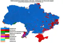 La seule langue officielle est l'ukrainien, mais le russe est aussi beaucoup utilisé, notamment dans le Sud et l'Est du pays, en raison de la domination de l'ancien Empire russe, y établissant notamment la colonie de Nouvelle-Russie, et de plusieurs siècles de russification.