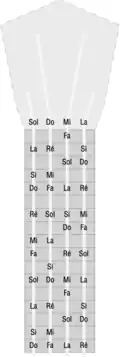 Sur l’image ci-à-gauche sont représentés les degrés d’une gamme majeure sur une portion de la touche d’un ukulélé. Les degrés en rouge sont les plus graves, les degrés en bleu les plus aigus.