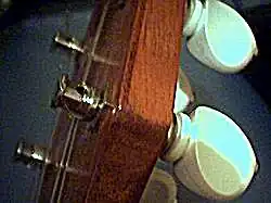 Modèle d'ukulélé électro-acoustique sans tête (à l'instar de certaines guitares de voyage) avec les clefs placées sur le côté supérieur du corps. N. B. : sur cette vue le chevalet est à gauche des clefs et le sillet “de tête” à droite, à l'extrémité du manche.