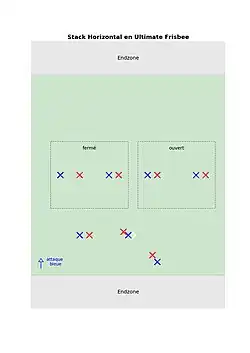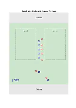 On distingue ainsi généralement en ultimate les côtés ouvert (open side) et fermé (break side), en fonction de la marque (force) imposée par la défense. Le fermé correspond à la moitié de terrain bloquée par le joueur à la marque, tandis que l'ouvert correspond à la moitié de terrain vers laquelle le joueur en possession du disque sera le plus en mesure de faire des passes. Les joueurs de champ (middle ou cutters) s'organisent généralement en ligne (stack) afin de ne pas bloquer des trajectoires de passe. Les formations offensives les plus courantes sont le stack vertical et le stack horizontal.