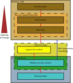L'UWB peut potentiellement fonctionner à des vitesses aussi élevées que le Wi-Fi, ce qui en fait potentiellement une technologie concurrente des LAN basés sur les normes IEEE 802.11 (Wi-Fi) et des WLAN. Cependant, l'UWB a de fortes contraintes de synchronisation en raison du très faible rapport cyclique utilisé.