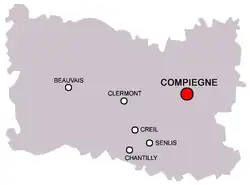 Par ailleurs, dans le département de l'Oise, Compiègne et son agglomération se trouvent à 60 km de Beauvais par la RN 31, vers l'ouest, qui en est la préfecture, à 40 km de Creil, au sud-ouest, qui en est la plus grande agglomération, et à 26 km de Noyon au nord-est.