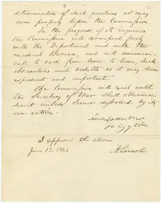 Après avoir réduit le champ d'action de la Commission aux régiments de volontaires, leur nouvel interlocuteur accepta finalement le principe d'une commission sanitaire et, le , le secrétaire à la Guerre publia un ordre nommant une commission[note 5] de neuf membres, dont les Drs Bellow et Van Buren, « en lien avec toute autre personne qu'ils choisiront de s'associer ». Dès le , ils appelèrent à leurs côtés George Templeton Strong (qui sera le trésorier de la Commission pendant toute la durée de la guerre) ainsi que les Drs Elisha Harris, Cornelius R. Agnew et J. S. Newberry. Le 20, ils confièrent le poste de secrétaire exécutif à Frederick Law Olmsted, architecte et concepteur de Central Park, qui allait incarner l'action de la Commission pendant la première partie de la guerre[note 6].
