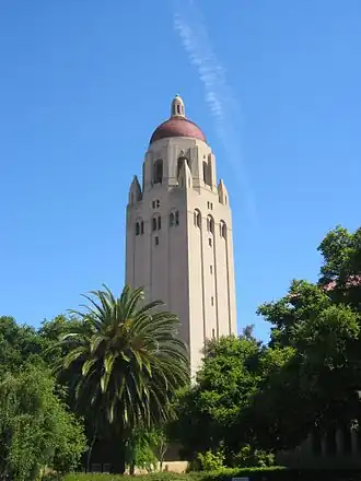 La Hoover Tower, appelée « HooTow » par les étudiants, est une tour d'environ 86 mètres située dans le campus[6]. Elle fait partie de la Hoover Institution, un centre de recherche fondé par l'ancien président des États-Unis Herbert Hoover sous le nom de « Hoover Institution on War, Revolution and Peace ». Achevée en 1941, l'année du 50e anniversaire de l'université, la tour possède un carillon de 48 cloches[6]. Ses neuf premiers étages sont dédiés à des rayonnages de bibliothèque et ses trois derniers étages à des bureaux. Une plateforme d'observation panoramique se trouve au quatorzième étage[6], à 76 mètres au-dessus du sol, et offre une vue sur tout le campus et la région environnante. La bibliothèque abrite des documents d'un intérêt exceptionnel : des collections complètes de journaux de la Révolution française (Le Père Duchesne, Le Vieux Cordelier), des ordres du jour de Mao Zedong pendant la Longue Marche, ainsi qu'un des exemplaires originaux du traité de Versailles de 1919. Le centre de recherches, en particulier du fait de l'intérêt qu'il a porté depuis 1945 aux phénomènes révolutionnaires (et, par voie de conséquence, à la recherche sur les techniques de contre-révolution), a acquis, notamment à l'époque de la guerre du Viêt Nam, la réputation d'être une « officine réactionnaire », dénoncée lors des manifestations qui se sont déroulées sur le campus à la fin des années 1960 et au début des années 1970.[réf. souhaitée]