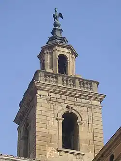 L’édifice traduit dans ses différentes parties l’évolution stylistique de sa période de construction. Ainsi, la façade intérieure, conçue par Miguel Marín à partir de 1751, est-elle d’un esprit classique appuyé, voire académiciste ; elle est décorée de pilastres, d’entablements et de frontons de l’ordre ionique, et d’une allégorie en relief de la Sagesse, œuvre de l'architecte et sculpteur Jaume Padró, et comporte deux tours jumelles de 33 mètres de hauteur. Chacune de ces tours présente deux compartiments superposés, celui du bas, à deux étages — l’étage inférieur logeant une horloge et celui supérieur étant percé de quatre fenêtres à arc plein-cintre avec clef de voûte —, que couronne une corniche et une balustrade à pinacles, et celui du haut, structure de pierre, de forme polygonale, à couronnement de bronze s’achevant par une aiguille faisant office de girouette. L’un des clochers renferme deux cloches[15]. Derrière cette façade intérieure s’étendent deux cours intérieures carrées identiques au milieu de chacune desquelles se dresse un édicule servant de fontaine.