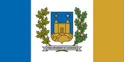 Les armoiries de l'Université de Montréal sont décrites en ces termes dans le langage héraldique : « D'azur à deux tours pointues d'or réunies par une courtine du même ton et surmontées à dextre d'une étoile d'or et à senestre d'une étoile d'argent »[20]. Créées par le vice-recteur Émile Chartier, les armoiries comprennent deux tours rappelant les origines de l'enseignement donné à Montréal aux Nord-Amérindiens par les prêtres sulpiciens et les religieuses de la congrégation de Notre-Dame. Les étoiles d'or et d'argent sont les symboles de la foi et de la science, que la devise de l'Université proclame : « Fide splendet et scientia » Elle rayonne par la foi et la science »)[21],[22]. Le drapeau de l'institution reprend les armoiries et la devise.