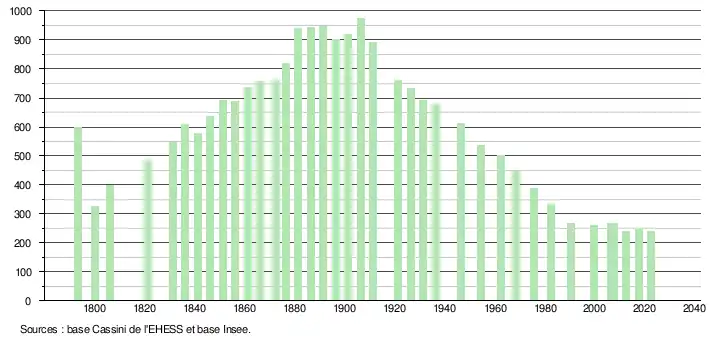 L'évolution du nombre d'habitants est connue à travers les recensements de la population effectués dans la commune depuis 1793. Pour les communes de moins de 10 000 habitants, une enquête de recensement portant sur toute la population est réalisée tous les cinq ans, les populations de référence des années intermédiaires étant quant à elles estimées par interpolation ou extrapolation[32]. Pour la commune, le premier recensement exhaustif entrant dans le cadre du nouveau dispositif a été réalisé en 2007[33].