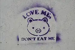 Le véganisme, ou végétalisme intégral, est un mode de vie consistant, au-delà d'une alimentation végétalienne, à exclure de consommer tout produit d'origine animale (cuir, suif, fourrure, laine, soie, cire d'abeille, etc.), ainsi que tout produit (cosmétique, notamment) testé sur des animaux, et plus généralement à éviter autant que possible toute forme d'exploitation ou de cruauté envers les animaux[15],[16]. Certains emplois humains d'animaux tels que les parcs zoologiques, l'équitation ou la cohabitation avec des animaux de compagnie peuvent prêter à débats entre véganes.