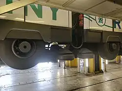 Les véhicules ne disposent pas de bogies mais d'essieux pivotants, disposés aux extrémités de chaque voiture[29],[32]. Chaque essieu est équipé de pneumatiques fournis par Michelin gonflés à une pression de 11 bars[14].