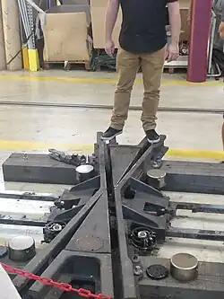Une nouvelle technique a donc été développée[31] : chaque essieu dispose d'un galet métallique disposé dans l'axe du véhicule qui vient s'engager entre les deux rails disposés au milieu de la voie au niveau des appareils. Une lame flexible disposant d'un débattement de 50 mm et d'une longueur réduite, reprenant le principe des aiguilles ferroviaires ordinaires, assure ainsi la direction du véhicule et permet de se passer des rails de guidage[31]. Par extension, cette solution peut être utilisée dans les garages-ateliers ou tout autre secteur où cela peut être jugé utile pour se dispenser des rails latéraux, par exemple, afin de faciliter la circulation des ouvriers[31],[17].