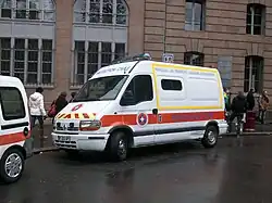 - ↑ Véhicule de transport sanitaire terrestre type B ; voir Arrêté du 28 août 2009 modifiant l'arrêté du 10 février 2009 fixant les conditions exigées pour les véhicules et les installations matérielles affectées aux transports sanitaires terrestres PDF avec annexes, faisant référence à la norme NF EN 1789 et à son guide d'application GA64-022 « Guide d’application de la norme NF EN 1789 »