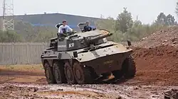 Prototype de véhicule de combat Rooikat sud-africain avec une motorisation hybride électrique qui assure une discrétion acoustique temporaire, en 2014.