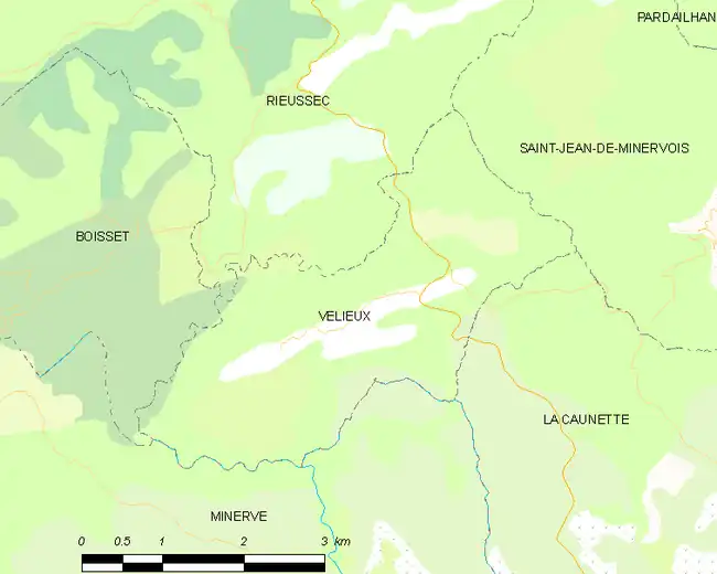 - ↑ « Orthodromie entre Vélieux et Saint-Jean-de-Minervois », sur fr.distance.to (consulté le ).