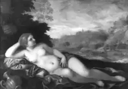 - ↑ Reclining Nude en anglais, logiquement Vénus allongée sur des tissus dans un décor extérieur. Peut-être Fitzwilliam Museum - OPAC Record mais le titre ne correspond pas, plus surement "Ruhende Venus", titre en allemand Vénus allongée.