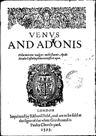 Le thème de Vénus et Adonis provient des Métamorphoses d'Ovide, livre 10, traduites en 1567 par Arthur Golding. Ovide raconte comment Vénus prit le bel Adonis pour amant, son premier parmi les mortels. Ils étaient compagnons de longue date, la déesse accompagnant son amant à la chasse. Elle le mit en garde en lui rappelant la légende d'Atalante et Hippomène, dans le but de le dissuader de chasser certains animaux dangereux; mais il ignora l'avertissement et se fit tuer par un sanglier.
