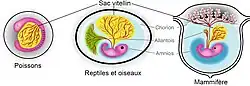 localisation du sac vitellin (en jaune) chez le poisson, les reptiles, les oiseaux et les mammifères