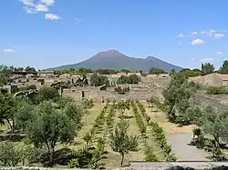 L'éruption du Vésuve en 79 s'est déroulée en deux phases[48], une éruption plinienne qui a duré 18 à 20 heures et projeté vers le sud une pluie de pierres ponces, pour recouvrir Pompéi d'une épaisseur allant jusqu'à 2,8 mètres, suivie d'une éruption péléenne avec une nuée ardente qui a atteint Misène vers l'ouest et le nord-ouest. Deux nuées ardentes ont envahi Pompéi, brûlant et asphyxiant les retardataires. Oplontis et Herculanum ont reçu la majeure partie des nuées et ont été ensevelies de fine cendre et de dépôts pyroclastiques[49],[50]