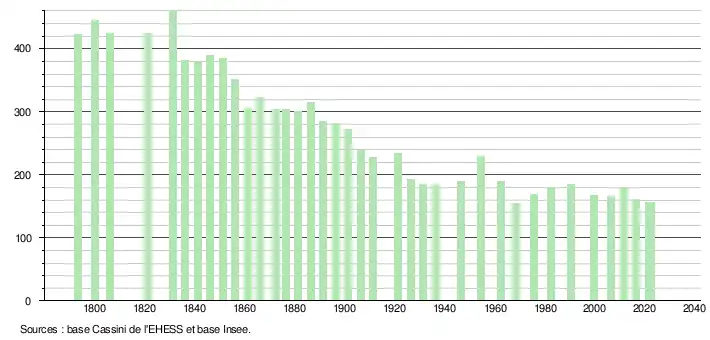L'évolution du nombre d'habitants est connue à travers les recensements de la population effectués dans la commune depuis 1793. Pour les communes de moins de 10 000 habitants, une enquête de recensement portant sur toute la population est réalisée tous les cinq ans, les populations de référence des années intermédiaires étant quant à elles estimées par interpolation ou extrapolation[20]. Pour la commune, le premier recensement exhaustif entrant dans le cadre du nouveau dispositif a été réalisé en 2006[21].