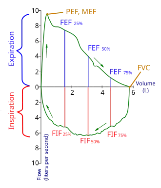 - Volume d'air expulsé avec force jusqu'au volume résiduel (VR) à partir de la capacité pulmonaire totale (CPT). La CVF se mesure de la manière suivante : le patient est assis ou debout, il inspire à fond et souffle le plus rapidement possible tout l’air de ses poumons dans le spiromètre. CVF est synonyme de « volume expiratoire forcé » (VEF), en anglais forced expiratory volume (FEV).