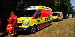 - ↑ Véhicule de transport sanitaire terrestre type B ; voir Arrêté du 28 août 2009 modifiant l'arrêté du 10 février 2009 fixant les conditions exigées pour les véhicules et les installations matérielles affectées aux transports sanitaires terrestres PDF avec annexes, faisant référence à la norme NF EN 1789 et à son guide d'application GA64-022 « Guide d’application de la norme NF EN 1789 »