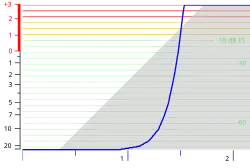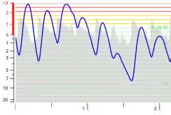 La zone grisée est le niveau en Décibel pleine échelle (dB FS) d'un signal normalisé à −1,5 dB FS, intégré sur 6,5 ms (réponse d'un PPM); le trait bleu indique la position de l'aiguille par rapport à la graduation du VU-mètre, à gauche. Le temps est en secondes.