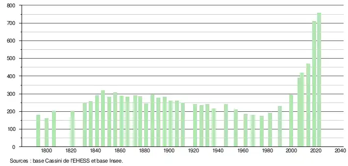 L'évolution du nombre d'habitants est connue à travers les recensements de la population effectués dans la commune depuis 1793. Pour les communes de moins de 10 000 habitants, une enquête de recensement portant sur toute la population est réalisée tous les cinq ans, les populations de référence des années intermédiaires étant quant à elles estimées par interpolation ou extrapolation[23]. Pour la commune, le premier recensement exhaustif entrant dans le cadre du nouveau dispositif a été réalisé en 2008[24].