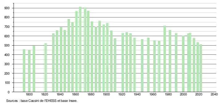 L'évolution du nombre d'habitants est connue à travers les recensements de la population effectués dans la commune depuis 1793. Pour les communes de moins de 10 000 habitants, une enquête de recensement portant sur toute la population est réalisée tous les cinq ans, les populations de référence des années intermédiaires étant quant à elles estimées par interpolation ou extrapolation[28]. Pour la commune, le premier recensement exhaustif entrant dans le cadre du nouveau dispositif a été réalisé en 2008[29].